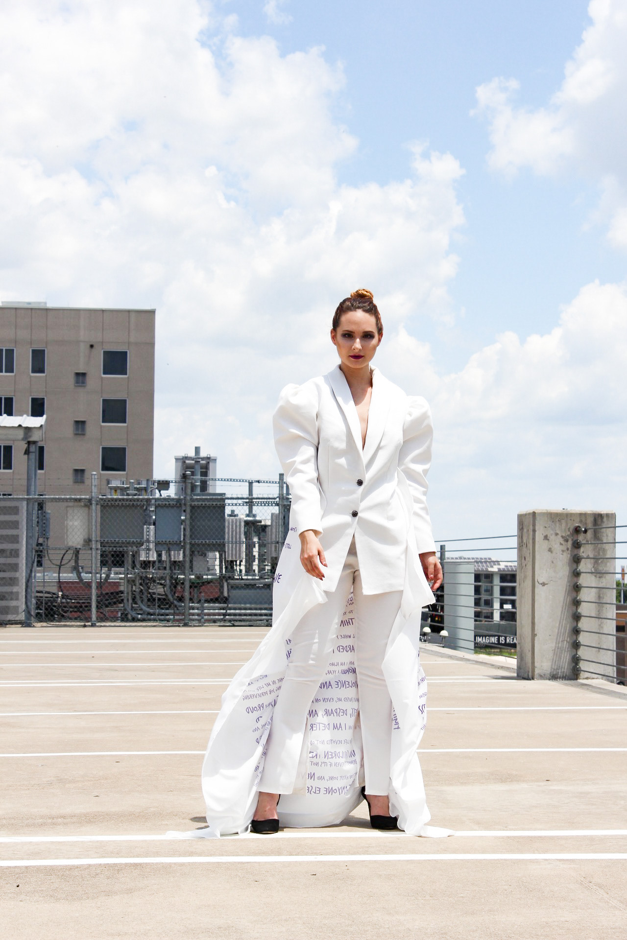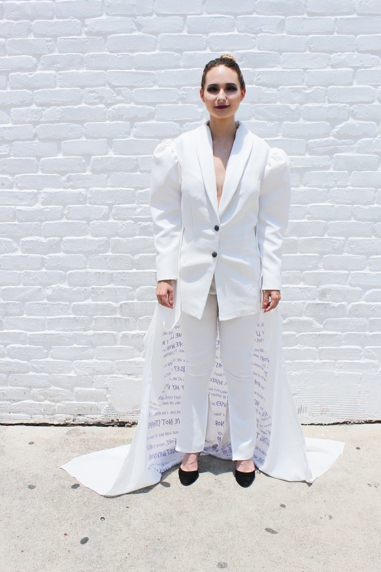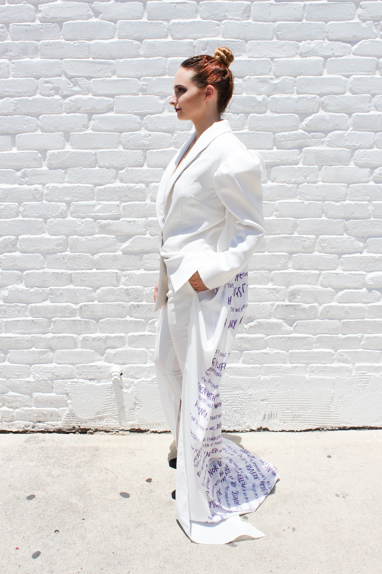OVERCOME was created for F/W2020 and was shown at the Fashion by Texas Virtual Austin Fashion Week on October 15th, 2020. The purpose of OVERCOME is to raise awareness for victims of domestic violence and sexual assault. This three look capsule collection was designed to portray the stages a victim of domestic violence or sexual assault experiences. This collection includes a suit printed with the words Jennifer spoke in court at the sentencing of her abuser. Jennifer also put out a request for other survivors of domestic violence and sexual assault to submit to her anonymously words in their own handwriting that describe their journey, as well as their thumbprints. Jennifer digitized these submissions and designed a textile print out of them, creating the final look of the collection. The "Rise Up" suit was created in FT4403 as a school assignment, but the rest of the collection was created outside of school. OVERCOME premiered at Fashion by Texas Virtual Austin Fashion Week Fall 2020.