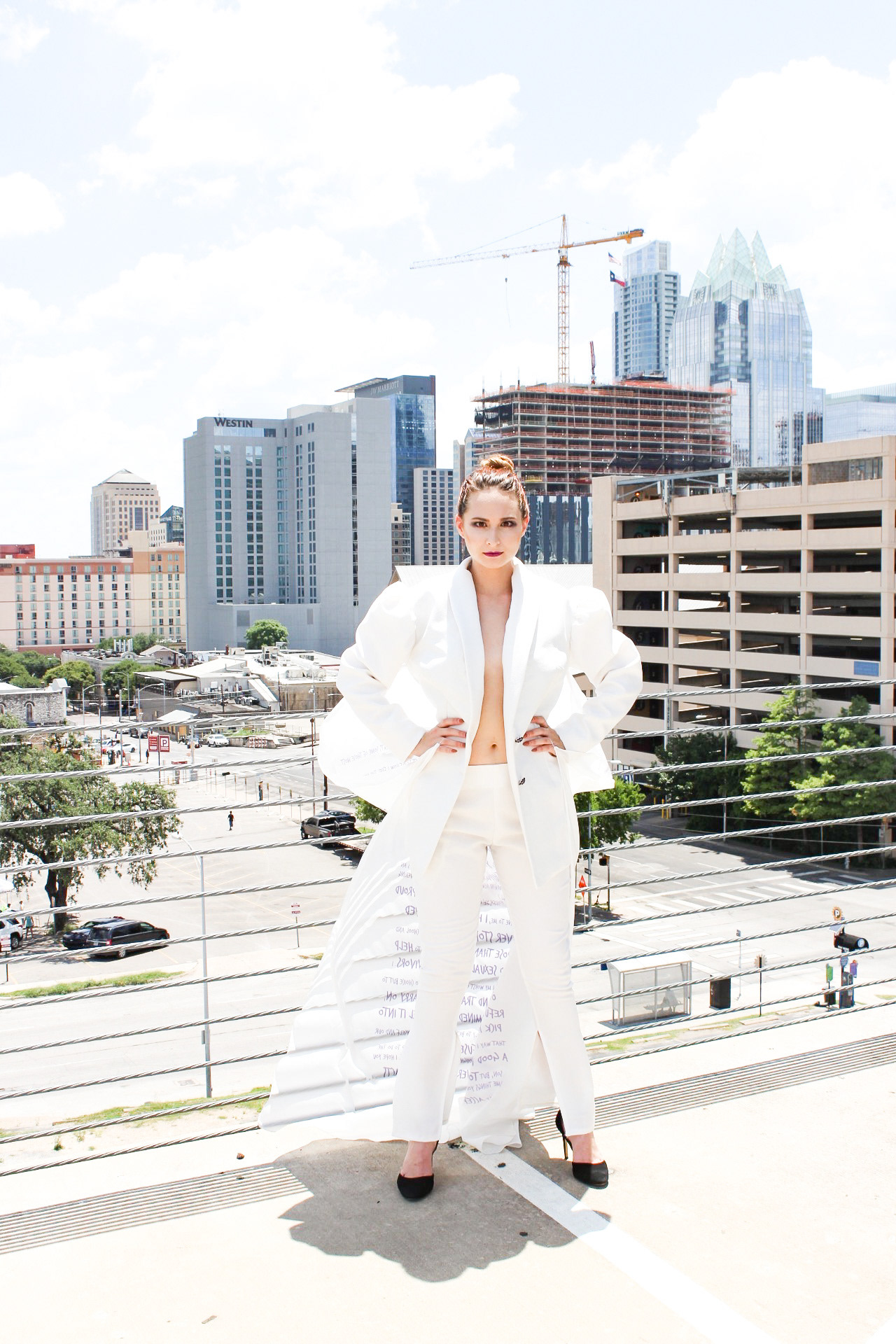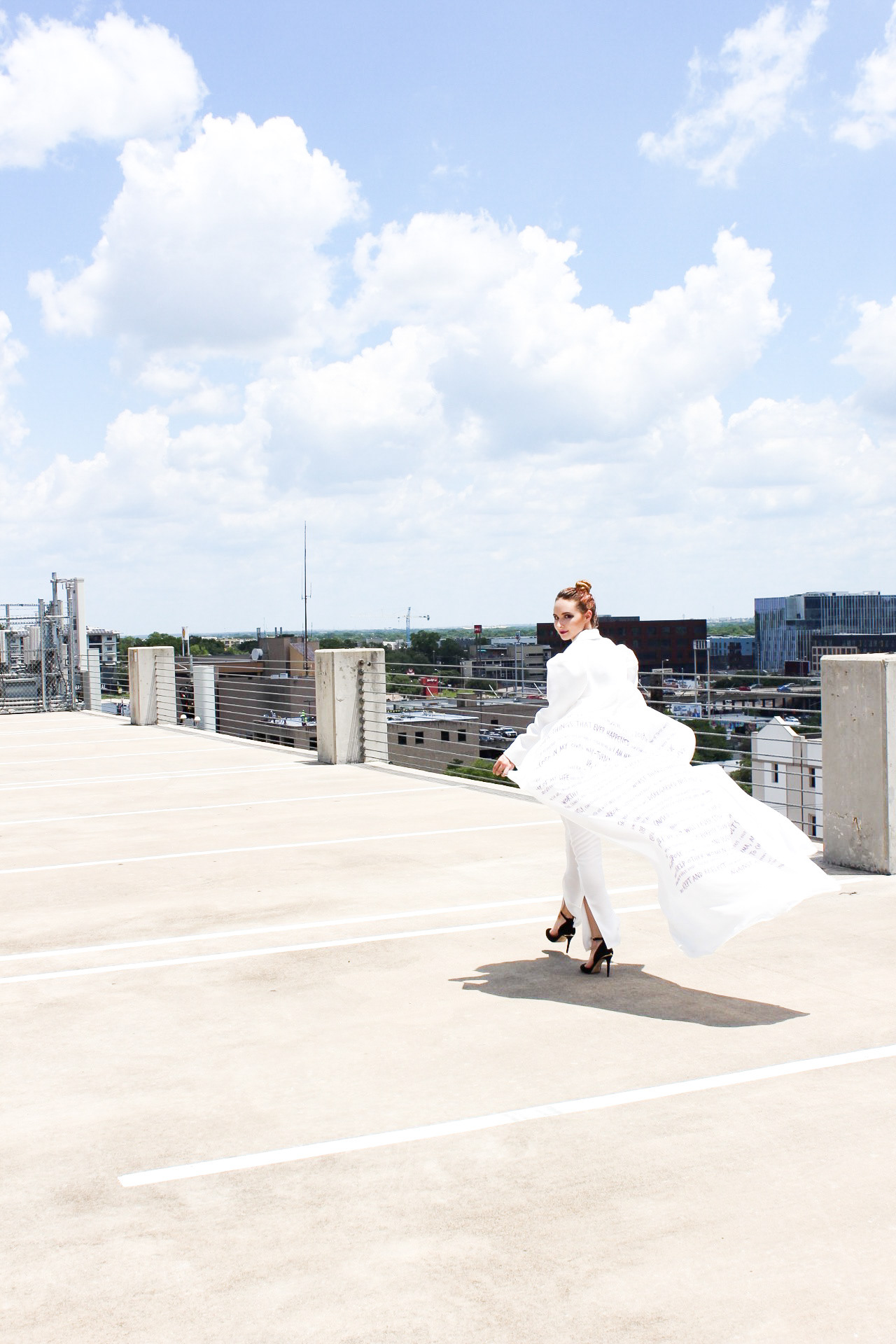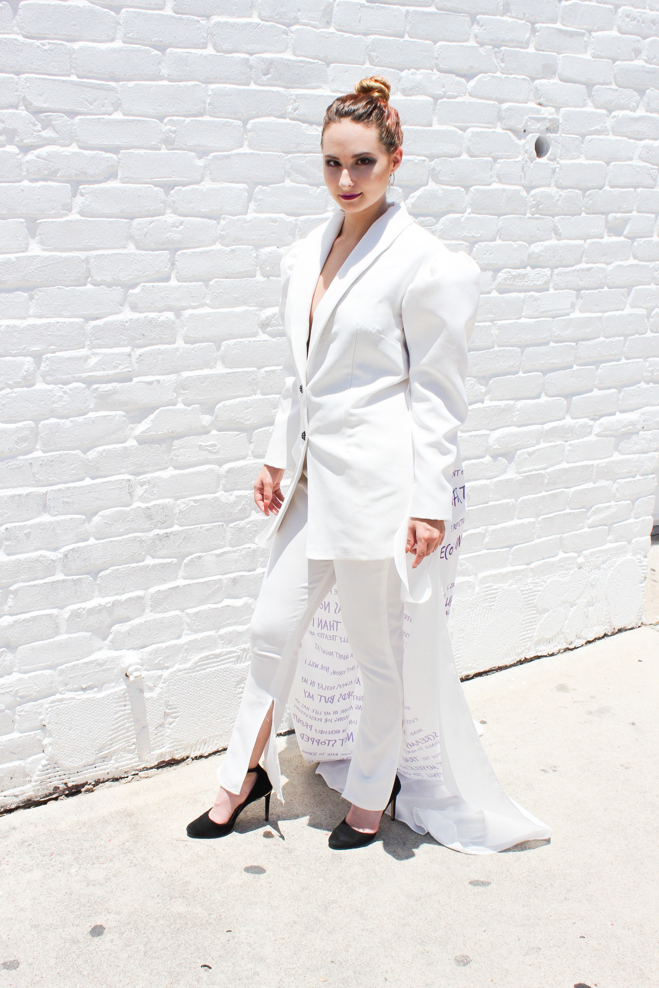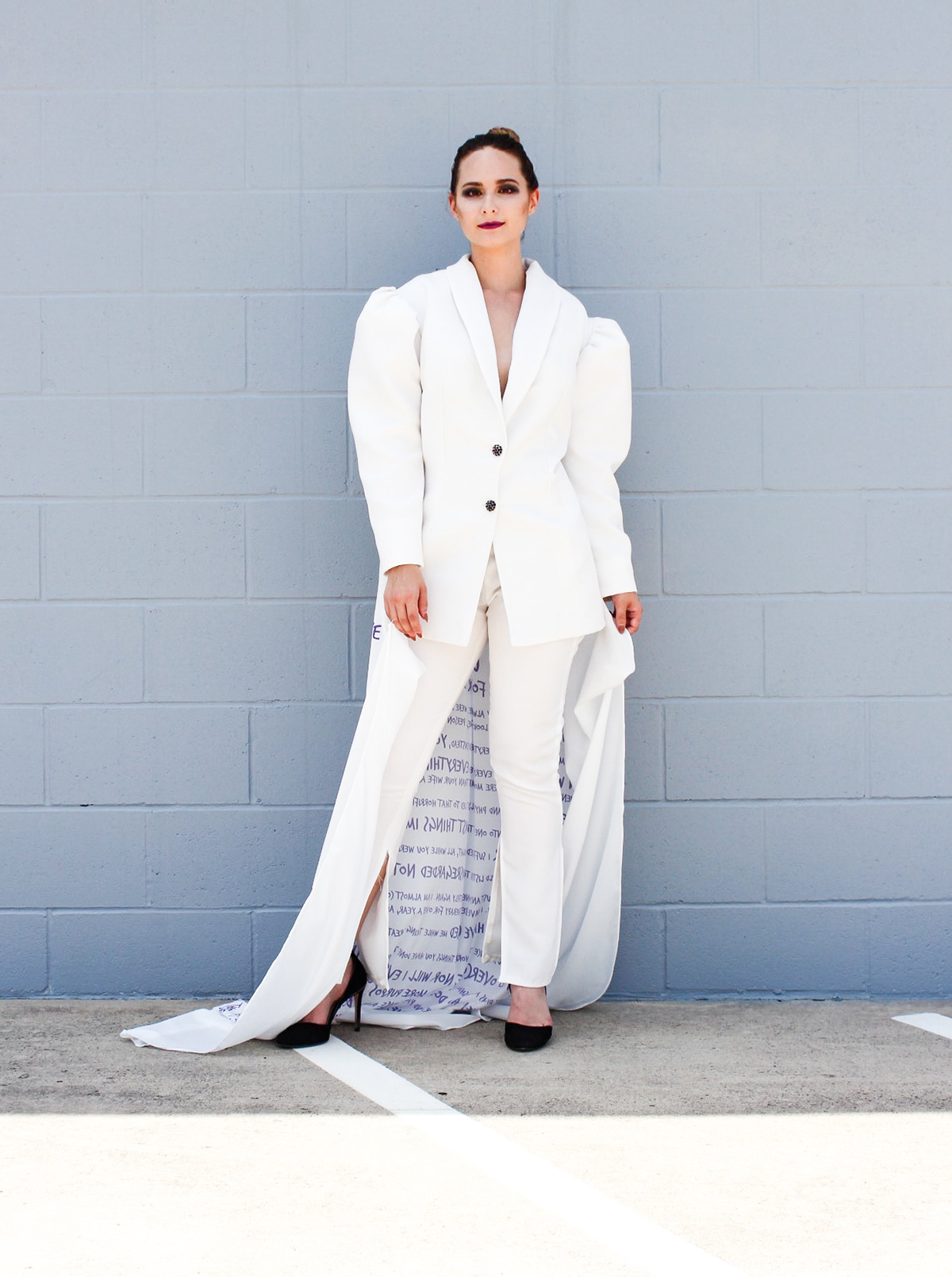 OVERCOME was created for F/W2020 and was shown at the Fashion by Texas Virtual Austin Fashion Week on October 15th, 2020. The purpose of OVERCOME is to raise awareness for victims of domestic violence and sexual assault. This three look capsule collection was designed to portray the stages a victim of domestic violence or sexual assault experiences. This collection includes a suit printed with the words Jennifer spoke in court at the sentencing of her abuser. Jennifer also put out a request for other survivors of domestic violence and sexual assault to submit to her anonymously words in their own handwriting that describe their journey, as well as their thumbprints. Jennifer digitized these submissions and designed a textile print out of them, creating the final look of the collection. The "Rise Up" suit was created in FT4403 as a school assignment, but the rest of the collection was created outside of school. OVERCOME premiered at Fashion by Texas Virtual Austin Fashion Week Fall 2020.